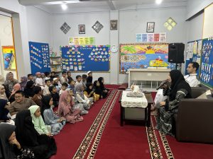 Dengan suasana interaktif dan menyenangkan, siswa berkesempatan untuk berdialog langsung, belajar sapaan dalam bahasa Arab dan Inggris, serta mendengarkan kisah inspiratif tentang semangat anak-anak Palestina dalam belajar.