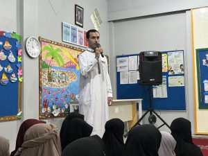 Dengan suasana interaktif dan menyenangkan, siswa berkesempatan untuk berdialog langsung, belajar sapaan dalam bahasa Arab dan Inggris, serta mendengarkan kisah inspiratif tentang semangat anak-anak Palestina dalam belajar.